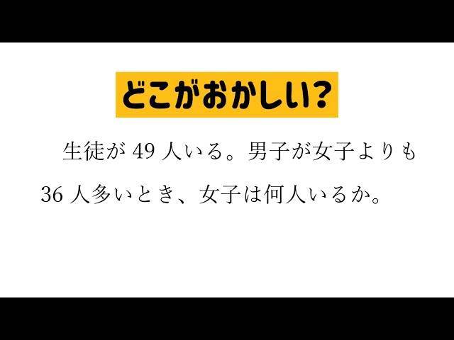 最近、海外のネットで話題になっている不思議な数学の問題についてお伝えします。この問題、どこかおかしいところがあるのです。それは、生徒全員の合計が49人で、男子は女子よりも36人多いという設定です。ここで女子の人数をx人とすると、男子はx+36人。式にすると、x + (x + 36) = 49になります。これを解くと、2x + 36 = 49、つまり2x = 13、x = 6.5です。しかし、人数が6.5人というのは現実としてあり得ません。この問題の本当の違和感は、設定そのものにあります。問題の条件を表にすると、女子が1人の場合、男子はその36人多く、計37人となります。これが繰り返されると、合計人数が2ずつ増加していきます。よって、生徒の合計が49人という奇数は実際には存在しえないのです。問題の状況が現実に合わない点が、この問題の真のポイントです。読んでいただきありがとうございます。問題解決の手助けになれば嬉しいです。