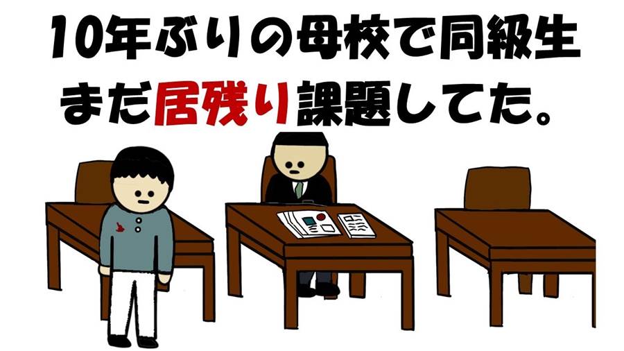 「懐かしいなぁ、あの頃と変わらない…」久しぶりに母校に足を踏み入れた僕は、昔の教室を見て胸が熱くなった。でも、目の前には信じられない光景が広がっていた。なんと、あの時の同級生が、今でも居残り課題をやっているというのだ。「お前、まだ課題やってるのか?」声をかけると、彼は恥ずかしそうに顔を赤らめながら言った。「実は、数学の課題がどうしても終わらなくて…完璧主義だから、満点じゃないと提出できないんだ。」10年も経って、彼はずっとこの学校に通い続けていたらしい。まさか、音楽室の倉庫に隠れて課題をやっていたなんて!「でも、もう卒業しないとまずいよな?」と僕が言うと、彼は目を輝かせながら、「手伝ってくれるのか?」と頼んできた。その瞬間、僕は決めた。「よし、教師を呼んで来るから、これで提出しよう!」