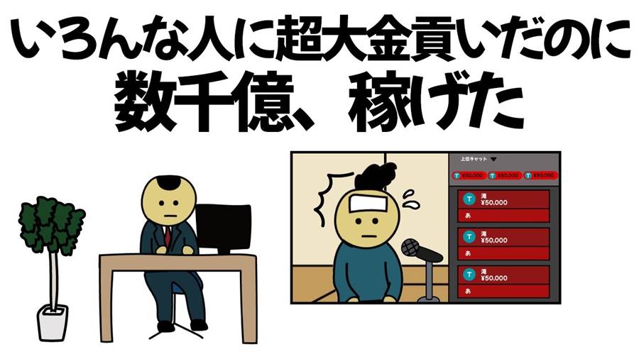 ユーチューブのスパチャで大金を稼ごうと決めた主人公、滝は、知人のインフルエンサーに目をつけた。しかし、その男は登録者数わずか2人の「インフルエンザ」男だった。それでも滝のスパチャは、男が自らのインフルエンザを告白した際に注目され、世界中の人々からスパチャが集まる結果となった。不思議な形で資産が増えた滝は、新しい計画を練る。今度は売れない剣道グラドル、コテちゃんに財を注ぎ込む。しかし、彼女の写真が好評になり、滝の努力はアクシデントによって大成功に。さらに、プレゼント企画で大勢にゲーム機を贈ろうとした際、リコールで全額が返金されてしまう。予想外の展開で、滝は意図せずして数千億を稼いでしまうが、心は晴れず、彼の生活は思わぬ方向へ向かう。