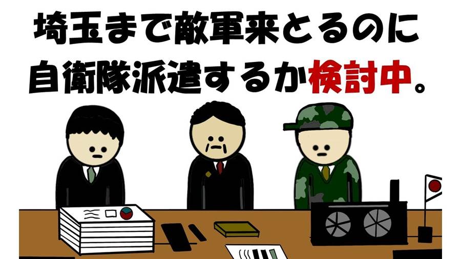 「総理、敵軍がついに埼玉まで来ました。市民は避難しています…」官房長官の報告が届く。日本の危機が、まさに目の前に迫っていた。「埼玉まで侵略されるとは…東京も近い。早く自衛隊を召集すべきだ!」僕の心の中では警鐘が鳴り響く。だけど、総理は冷静さを保とうと必死に検討していた。「自衛隊を全軍召集するか、法案をどう出すか…まだ決められません。」その間にも、敵軍はどんどん進行してきている。ついには東京近郊、官邸まで迫ってきたという報告も入る。「こんな時に、何を検討してるんだ?」僕は心の中で叫んだ。そして、ようやく総理は決断を下す。「よし、国民と全世界に向けて、声明文を発表する。」声が響く。「今すぐ放送をつなげろ!」「日本は今、歴史的な危機を迎えています。」