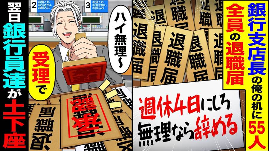 私はトランス銀行の支店長として、日々忙しく働いていた。ところが、ある日突然、55人の行員全員から一斉に退職届が届けられた。内容は驚愕の要求だった。「週休4日を実現しろ。無理なら辞める」というのだ。正直、私はその要求を受け入れる余裕がなかった。業務の効率化や顧客対応を考えると、週休4日など到底実現できない。それでも、退職届を受理するしかなかった。「仕方ない、受理します」と答えるしかなかった。翌日、事態は予想外の展開を迎えた。退職届を提出した行員たちが、私の元に集まり、土下座をして謝罪を始めた。どうやら彼らは、週休4日が実現すると思い込み、勢いで行動してしまったようだ。しかし、私も一度決めたことを撤回するわけにはいかない。最終的には、彼らの要求が現実的でないことが明白になり、全員が後悔の念を抱えていた。しかし、何よりも大事なのは、業務が円滑に回ること。そして、これを教訓に、今後は冷静な判断を下すことを誓った。この出来事は、銀行業界でも大きな話題となり、組織の運営や労働条件に対する新たな視点を提供することとなった。