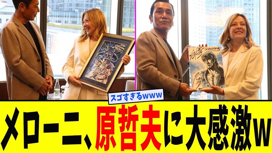 イタリアのジョルジャ・メローニ首相が漫画「北斗の拳」の大ファンであることは広く知られていますが、先日その夢の瞬間が実現しました。メローニ首相は日本を訪問し、「北斗の拳」の原作者である原哲夫氏と東京都内で歴史的な対面を果たしました。面会が行われたのは、メローニ首相の誕生日翌日でした。原氏はその特別な日を祝うため、メッセージ付きのジークレイ版画に「ケンシロウ」を描き、プレゼントしました。思いが込められたこの贈り物は、メローニ首相の心を強く打ち、その場には笑顔と感謝の言葉があふれました。画を手に取った首相は「先生のアートは素晴らしい」と称賛し、それに応える形で原氏は「首相こそ絵になる方です」と述べました。